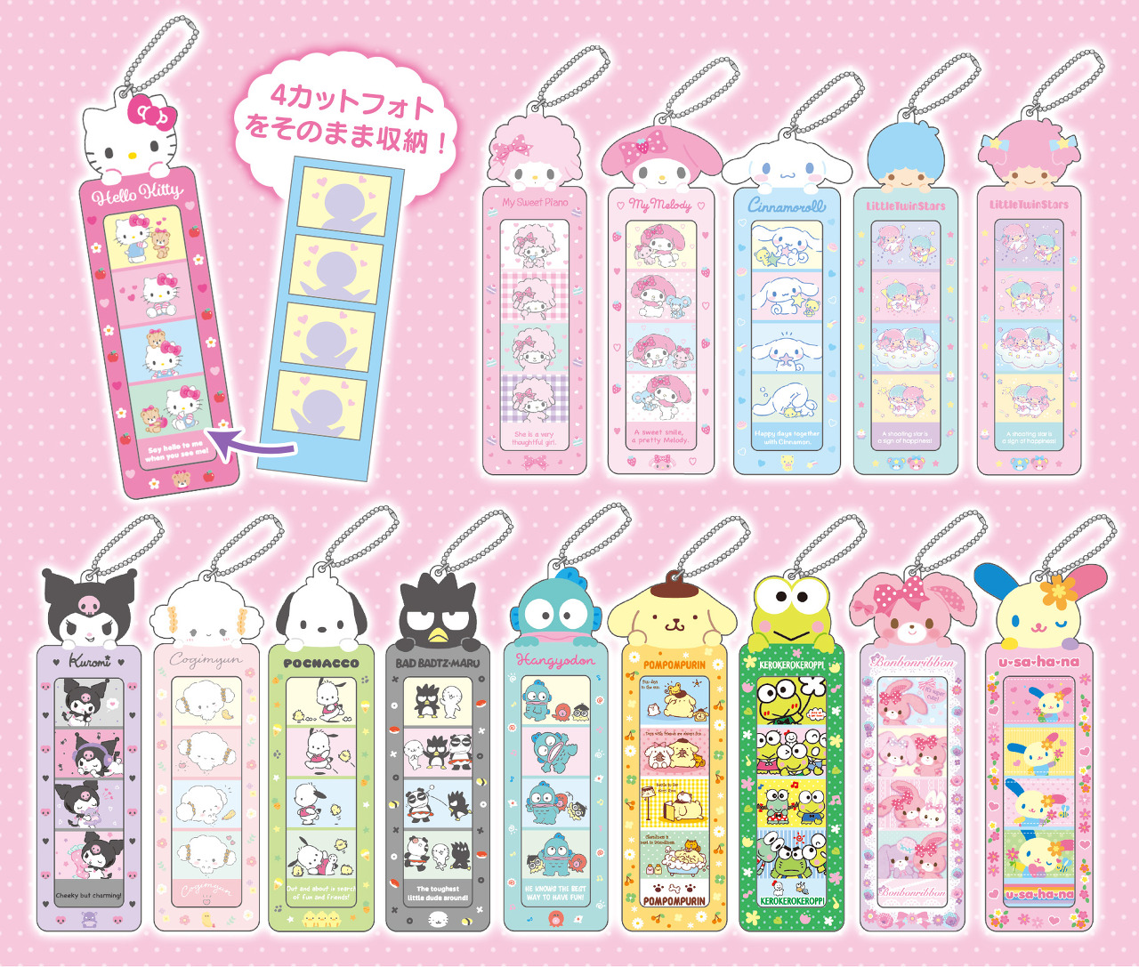4컷 사진을 넣을 수 있는 산리오 포토 홀더가 나왔어요! 일본 전국 돈키호테 계열 점포와 아피타, 피아고 등에서 구매 할 수 있다고 합니다! 랜덤이라서 어떤 캐릭터가 나올지 두근두근 도키도키하네요!!